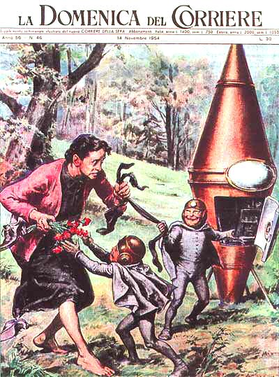 Uno dei più celebri incontri ravvicinati italiani, il "caso Lotti". Nel novembre del 1954 la signora Lotti trovò una piccola astronave nel boschetto in località Cennica (SI). Dal velivolo sbucarono due esseri (riprodotti nella vignetta) che fotografarono la donna, la quale fuggì verso il paese. Il caso ebbe molta eco sulla stampa.