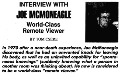 Joseph McMoneagle ha sessantasei anni e vive in Florida, dove gestisce gli affari della sua piccola, particolarissima azienda, la Intelligence Applications Inc. Di cosa si occupa? Semplice: di visione a distanza. Ossia di spiare ciò che accade in punti remoti del mondo utilizzando i poteri della mente.